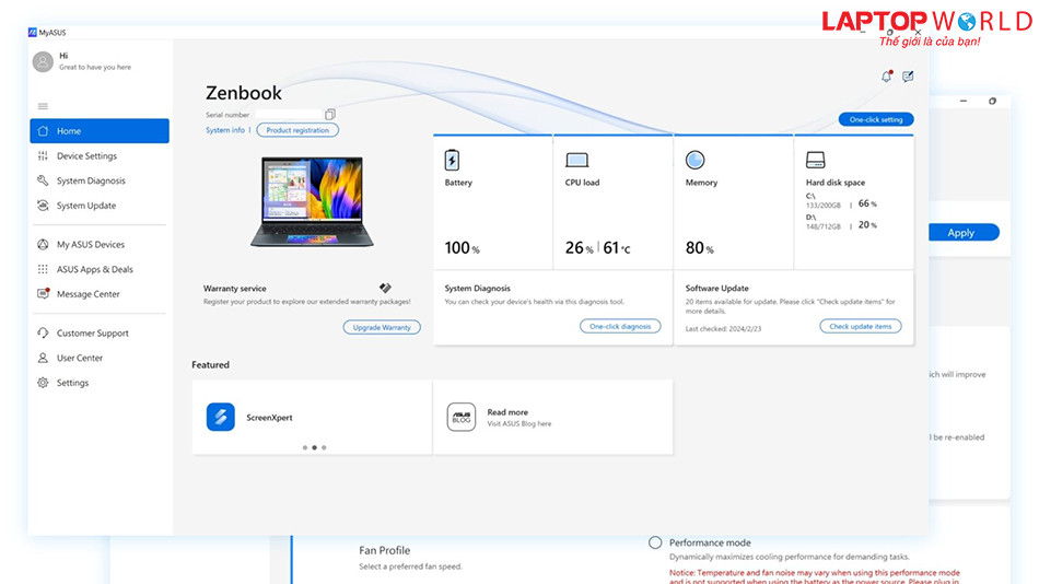 Sở hữu một chiếc laptop ASUS, bạn sẽ được hỗ trợ bởi ứng dụng MyASUS giúp tối ưu hóa phần cứng một cách dễ dàng.