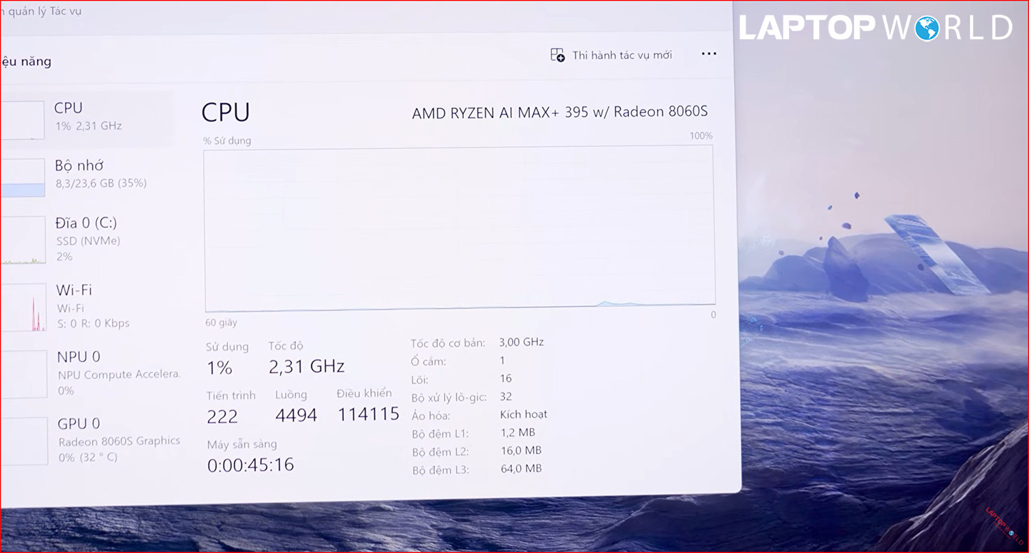 Trái tim của ROG Flow Z13 (2025) là vi xử lý Ryzen™ AI MAX+ 395 với 16 nhân và 32 luồng, cho phép xử lý các tác vụ nặng như render video 4K hay đa nhiệm phức tạp một cách mượt mà.