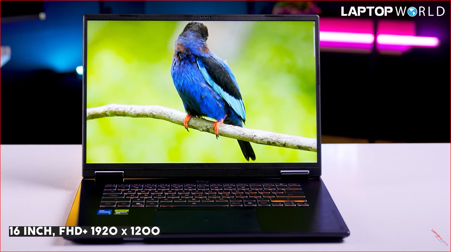 Điểm khác biệt lớn nhất của Gigabyte A16 so với các dòng laptop gaming truyền thống chính là màn hình. Với kích thước 16 inch và tỷ lệ 16:10, không gian hiển thị được mở rộng thêm về chiều dọc.