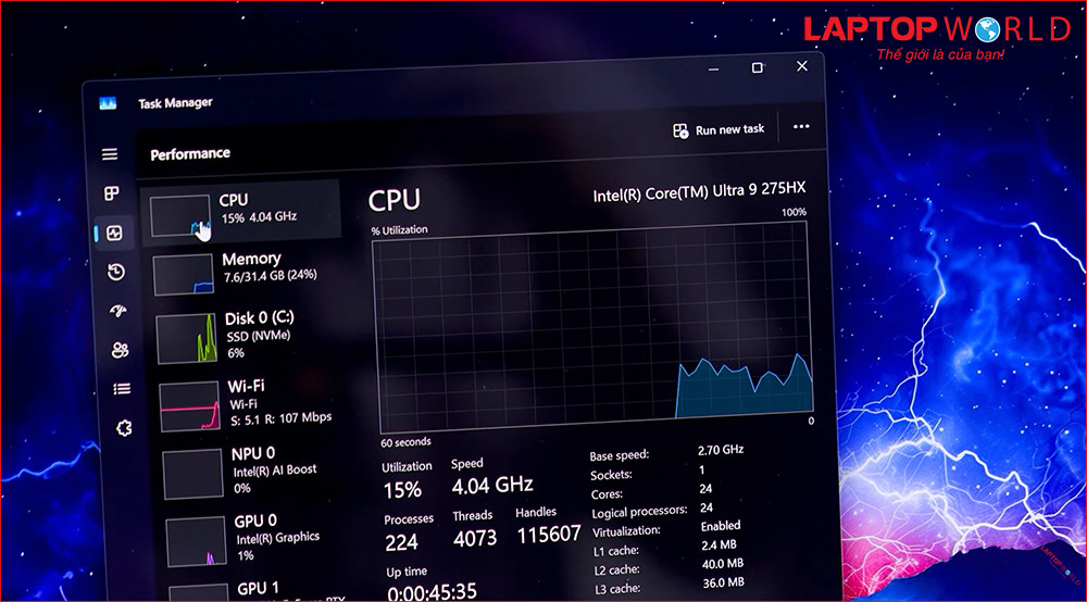 Điểm khiến giới công nghệ "sục sôi" chính là cấu hình bên trong. Cả hai phiên bản đều trang bị vi xử lý Intel Core Ultra 9 275HX – con chip mạnh mẽ nhất phân khúc với 24 nhân và 24 luồng, tối ưu hoàn hảo cho các tác vụ tính toán AI và đồ họa nặng.