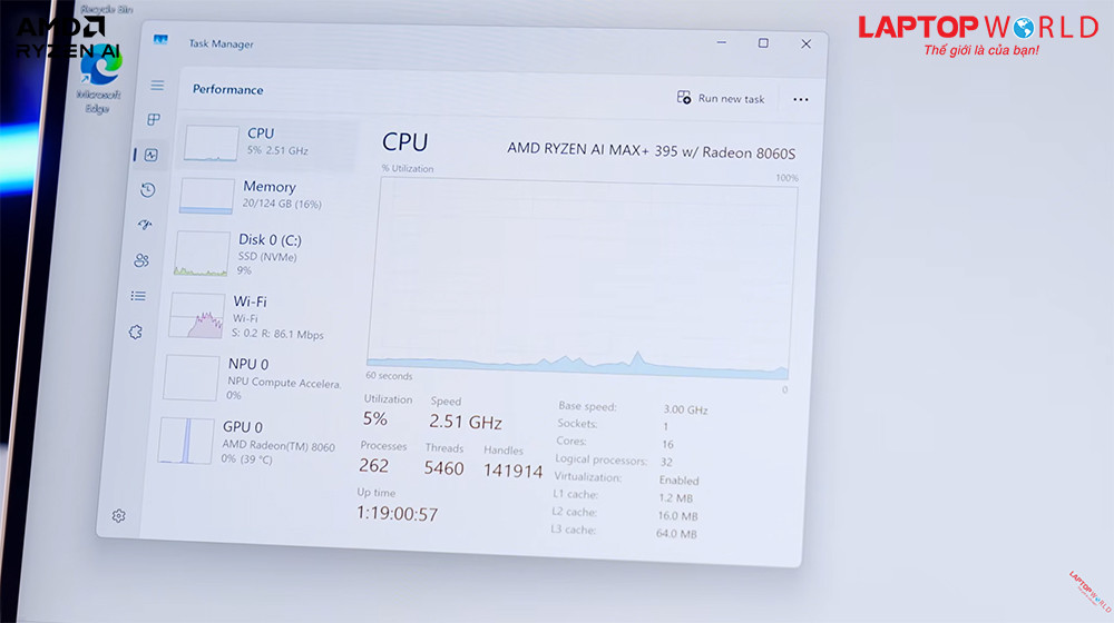 Điểm gây sốc nhất trên ROG Flow Z13 GZ302EAC chính là sự xuất hiện của vi xử lý Ryzen AI MAX+ 395. Đây là con chip thuộc dòng Strix Halo mới nhất từ AMD, được thiết kế để mang hiệu năng của những dàn PC desktop cao cấp vào một thiết bị mỏng nhẹ. Với kiến trúc Zen 5 và nhân NPU mạnh mẽ, con chip này không chỉ xử lý mượt các tựa game AAA mà còn là "cỗ máy" thực thụ cho các tác vụ trí tuệ nhân tạo (AI) phức tạp nhất hiện nay.