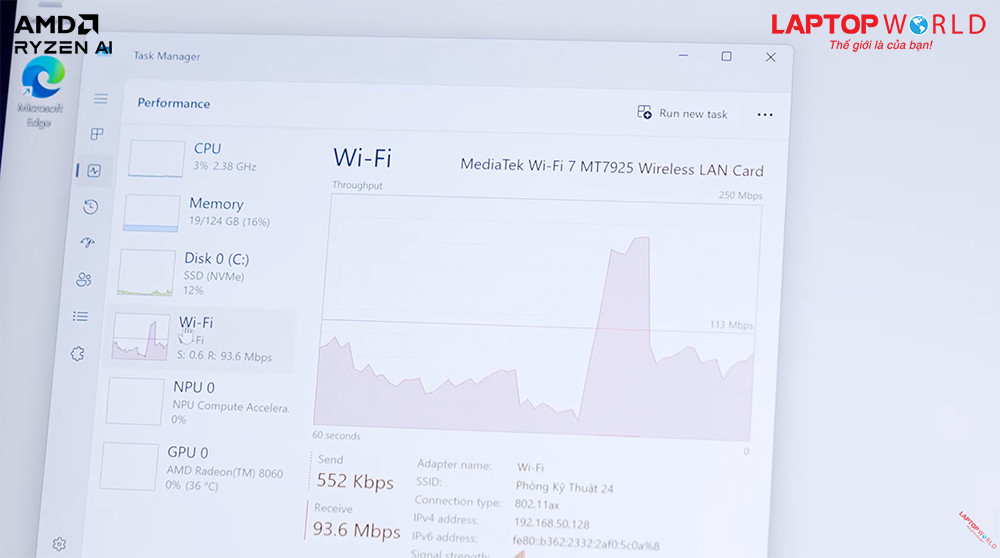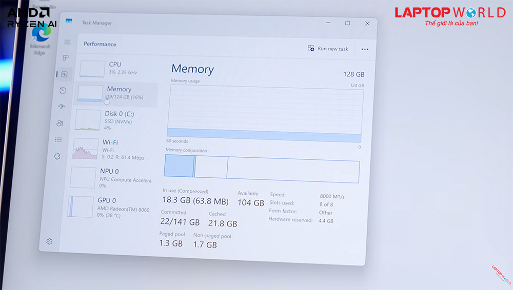 Nếu như 16GB hay 32GB RAM đã là tiêu chuẩn cho game thủ, thì con số 128GB RAM trên một chiếc máy 13.4 inch là điều chưa từng có tiền lệ. Mức dung lượng này biến Flow Z13 từ một chiếc máy chơi game đơn thuần trở thành một Workstation di động đúng nghĩa. Bạn có thể vừa render video 8K, vừa mở hàng trăm tab Chrome, vừa chạy các mô hình giả lập mà máy vẫn không hề có dấu hiệu "hụt hơi".