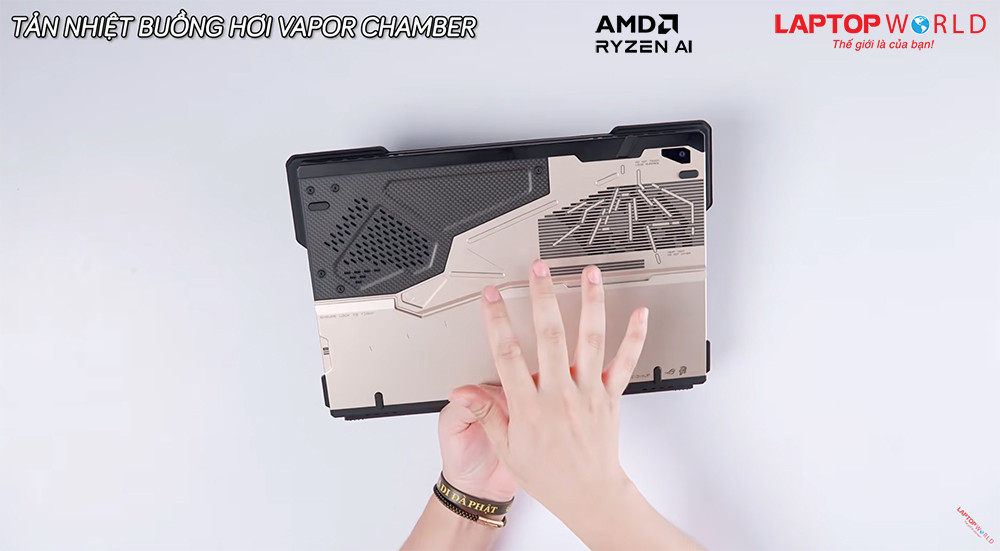 Để gánh được cấu hình khủng, máy sử dụng buồng hơi (Vapor Chamber) bằng thép không gỉ cải tiến, kết hợp cùng quạt Arc Flow thế hệ 2 và keo tản nhiệt kim loại lỏng để duy trì sự yên tĩnh ngay cả khi tải nặng