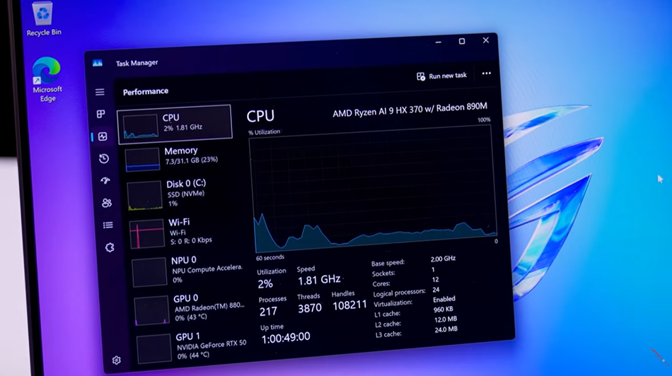 Asus ROG Zephyrus G14 GA403WP-QS045WS sở hữu bộ vi xử lý AMD Ryzen AI 9 HX 370 với 12 nhân, 24 luồng, xung nhịp tối đa 5.1GHz và bộ nhớ đệm 36MB. Điểm nổi bật là NPU AMD XDNA với sức mạnh lên tới 50 TOPS, tăng tốc các tác vụ AI như xử lý ngôn ngữ, hình ảnh, video và hỗ trợ tối đa Microsoft Copilot cũng như các ứng dụng AI đời mới.