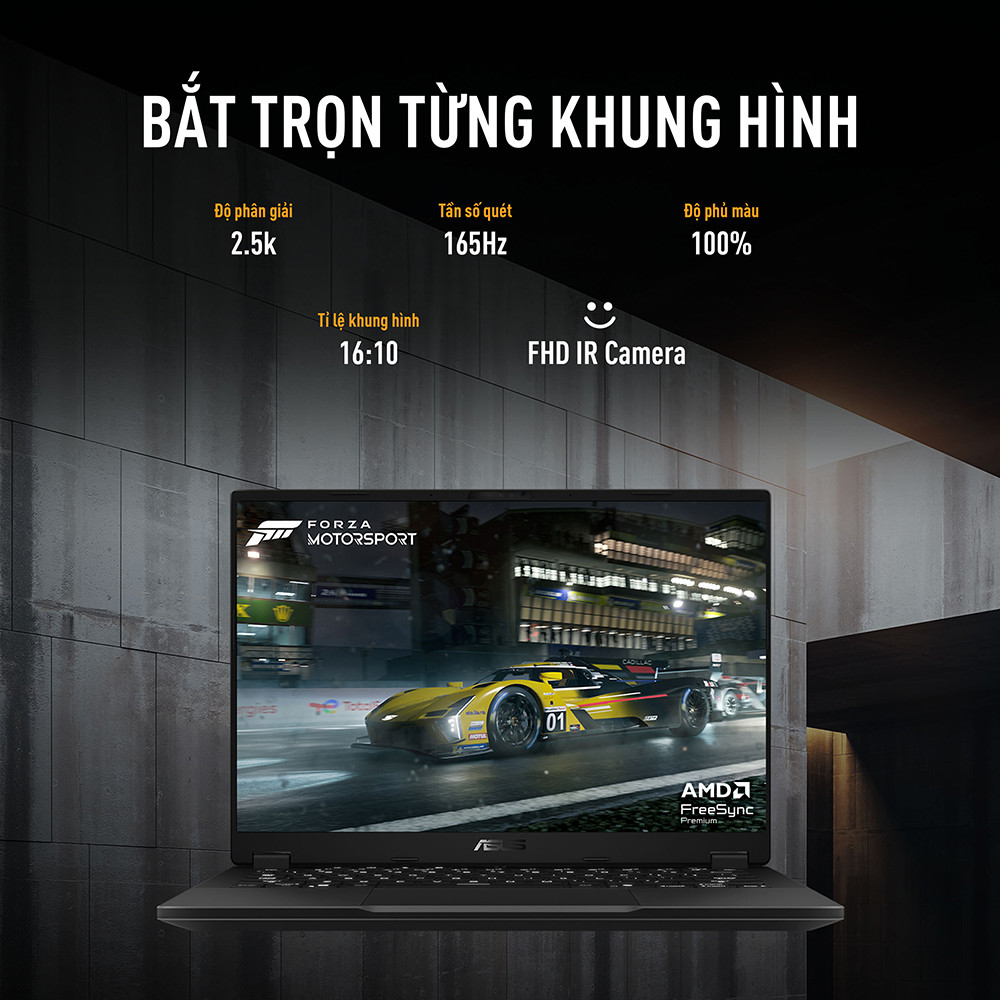 Không chỉ dành cho game thủ, TUF A14 còn là trợ thủ đắc lực cho các nhà sáng tạo nội dung nhờ màn hình độ phân giải 2.5K sắc nét. Tần số quét 165Hz cùng thời gian phản hồi 3ms mang lại lợi thế vượt trội trong các tựa game tốc độ cao, loại bỏ hoàn toàn hiện tượng xé hình. Bên cạnh đó, độ phủ màu 100% sRGB đảm bảo mọi màu sắc hiển thị luôn chân thực, sống động và chuẩn xác nhất.