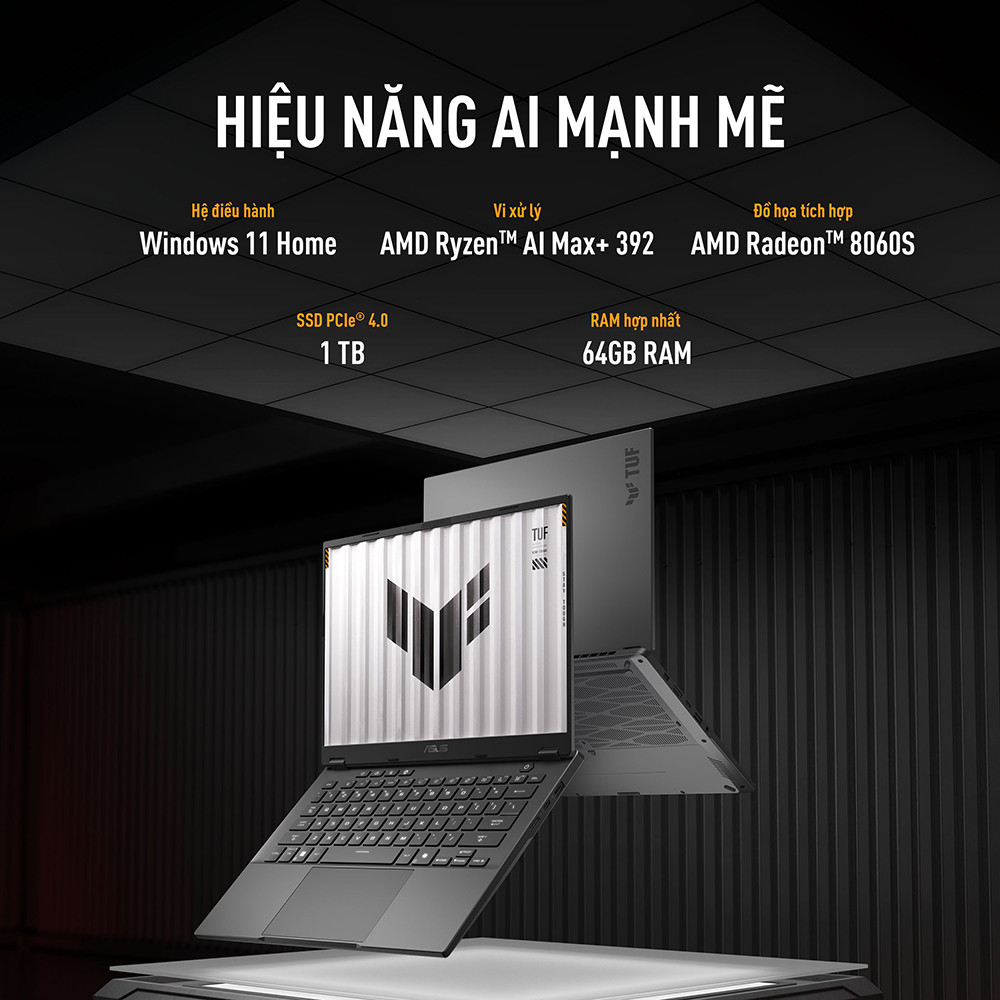 Ẩn sau thân hình nhỏ gọn là sức mạnh khổng lồ từ vi xử lý AMD Ryzen™ AI Max+ 392. Điểm nhấn đặc biệt của TUF A14 năm nay chính là 64GB RAM hợp nhất mạnh mẽ, mang lại khả năng xử lý đa nhiệm tuyệt đỉnh và băng thông rộng rãi cho các tác vụ AI. Dù bạn đang cày game AAA, dựng video hay chạy các ứng dụng đồ họa phức tạp, máy vẫn đảm bảo tốc độ phản hồi chớp nhoáng và mượt mà.