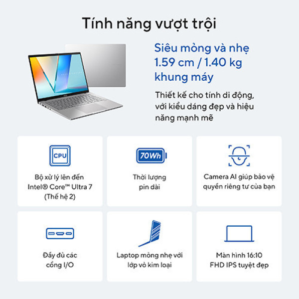 Với độ mỏng chỉ 1,59cm và trọng lượng nhẹ 1,4kg, Vivobook S14 trở thành lựa chọn lý tưởng cho những người dùng thường xuyên di chuyển. Chiếc laptop dễ dàng nằm gọn trong ba lô, theo người dùng đến lớp học, quán cà phê hay văn phòng suốt cả ngày mà không gây cảm giác nặng nề. Lớp vỏ kim loại cao cấp kết hợp cùng khả năng đạt chuẩn độ bền quân đội MIL-STD-810H giúp Vivobook S14 sẵn sàng chịu được va đập, thay đổi nhiệt độ và những điều kiện sử dụng khắc nghiệt nhất, đảm bảo sự bền bỉ trong mọi hành trình học tập, công tác hay giải trí.