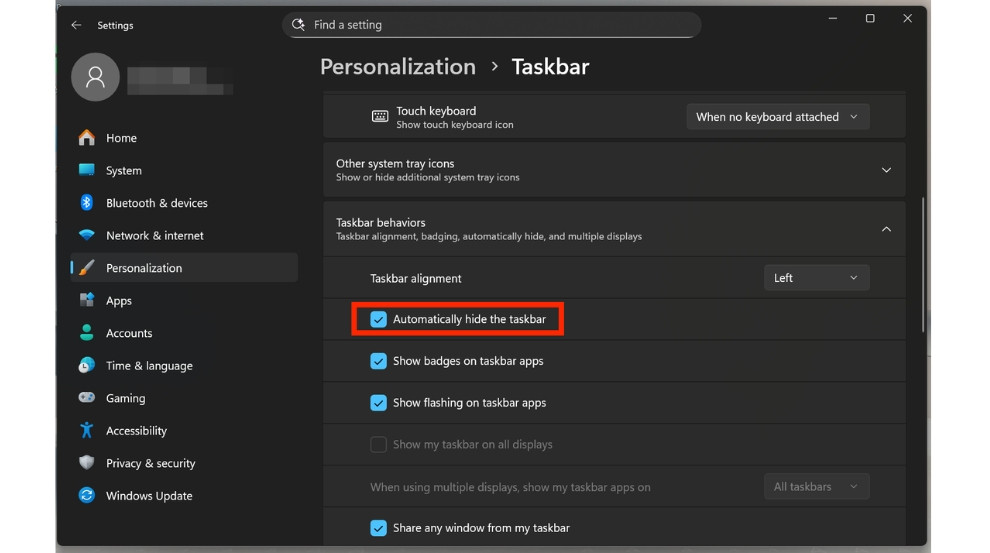 Ẩn thanh taskbar của Windows: Thanh taskbar là vùng giao diện tĩnh, dễ gây lưu ảnh nếu hiển thị liên tục; việc ẩn taskbar giúp giảm một vùng điểm ảnh cố định luôn bật ở độ sáng cao.