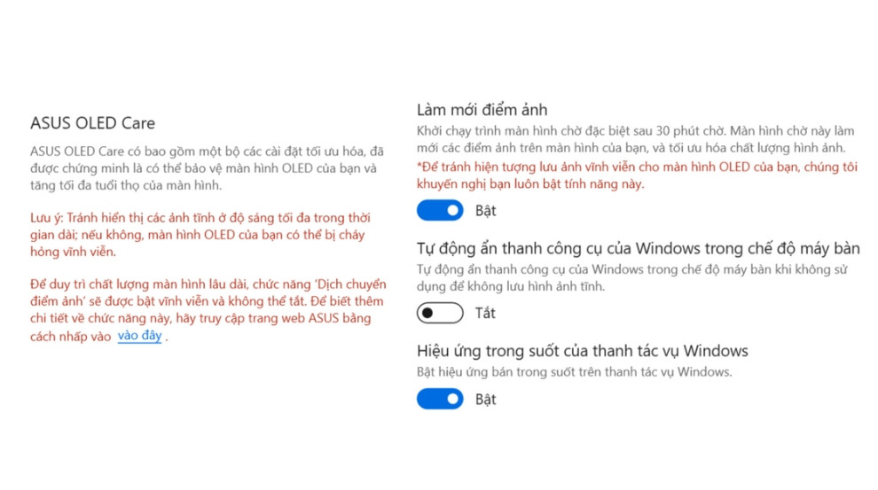 Để đảm bảo độ bền lâu dài, người dùng nên ưu tiên các nhà sản xuất có nhiều kinh nghiệm triển khai OLED trên laptop. Những hãng đầu tư bài bản vào công nghệ tối ưu tuổi thọ điểm ảnh và hệ thống bảo vệ tấm nền - điển hình như ASUS với bộ giải pháp OLED Care - sẽ mang đến độ ổn định cao hơn trong quá trình sử dụng. Đây là yếu tố quan trọng giúp màn hình duy trì chất lượng hiển thị và hạn chế tối đa nguy cơ burn-in theo thời gian.