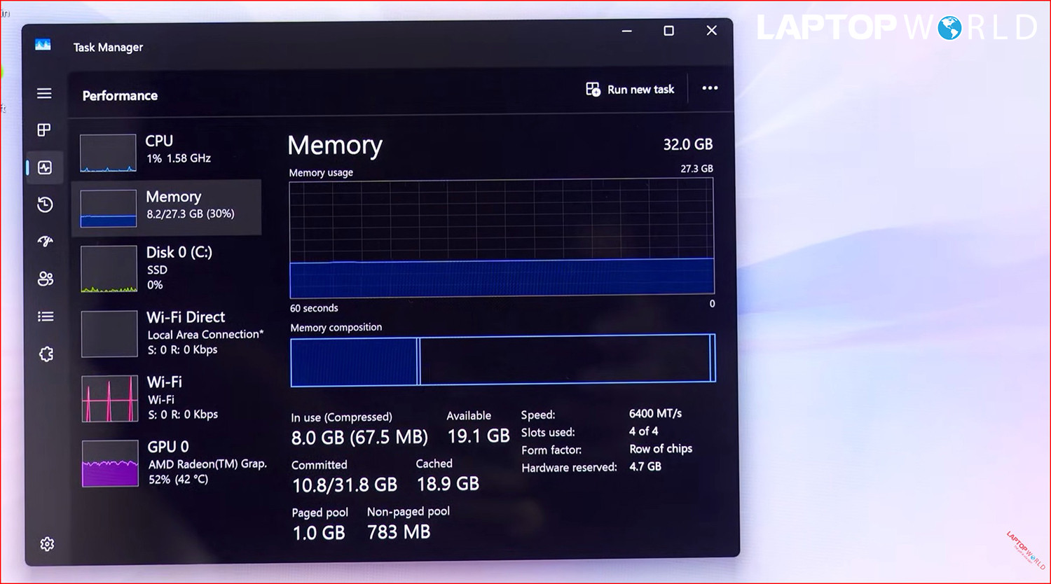 Điểm gây sốc nhất trên chiếc laptop này chính là dung lượng Ram lên tới 32GB LPDDR5x. Trong khi hầu hết các đối thủ cùng tầm giá vẫn đang dừng lại ở mức 16GB, việc trang bị 32GB giúp người dùng hoàn toàn yên tâm về khả năng đa nhiệm. Bạn có thể mở đồng thời hàng chục tab Chrome, chạy máy ảo, render video 4K hoặc xử lý các file Excel nặng hàng trăm MB mà không lo bị tràn RAM hay giật lag.