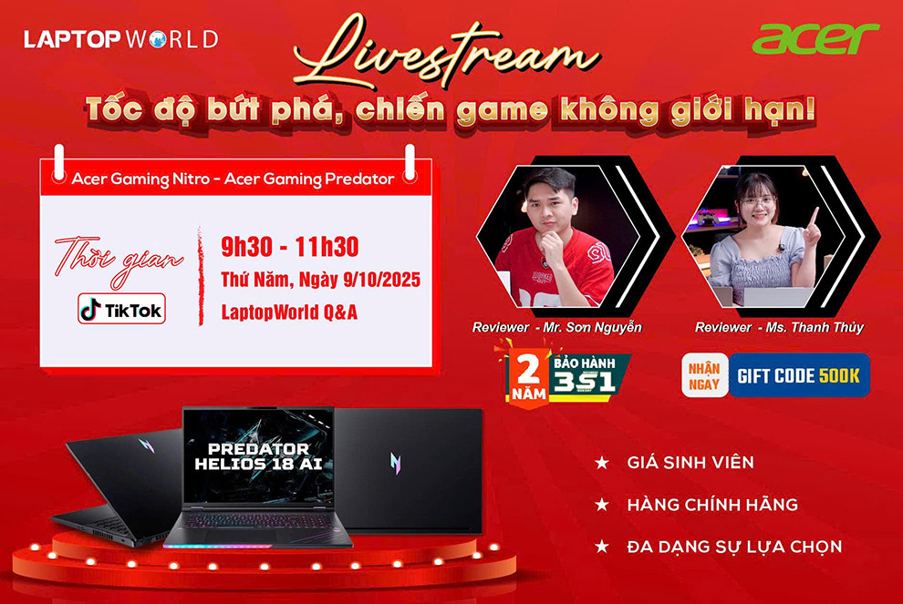 Tham gia livestream, bạn sẽ được xem review chi tiết và test hiệu năng thực tế cùng hai Reviewer công nghệ: Sơn Nguyễn và Thanh Thủy – những người sẽ chia sẻ góc nhìn chân thực nhất về các mẫu laptop gaming Acer mới nhất năm 2025.