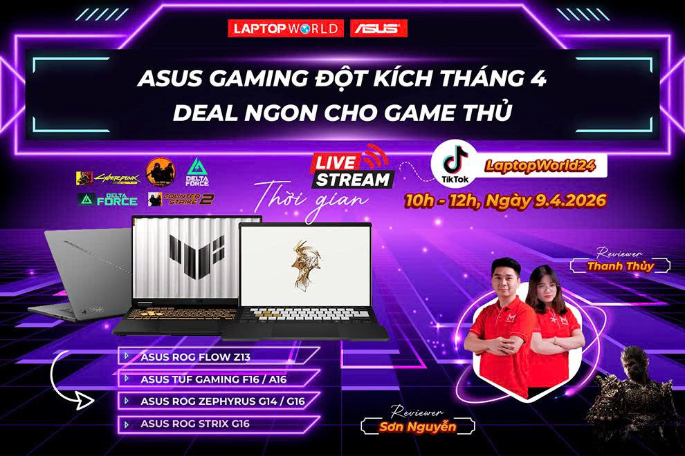 Cơ hội sở hữu "vũ khí" hạng nặng từ LaptopWorld x ASUS đã đến! Đừng bỏ lỡ buổi Livestream đặc biệt để săn những siêu phẩm Laptop Gaming mạnh mẽ nhất năm 2026 với mức giá cực hời.