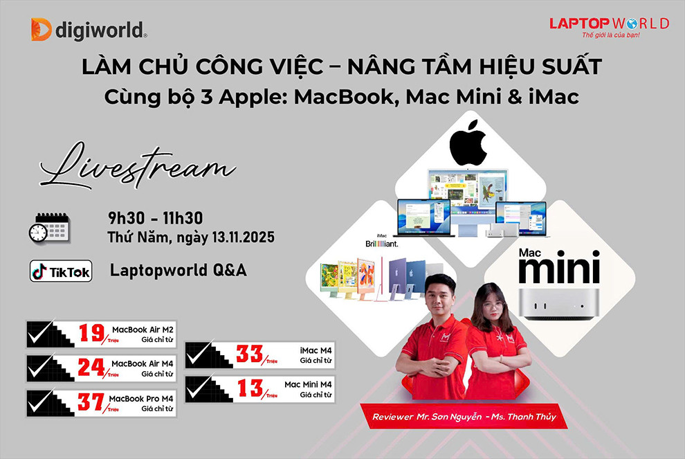 Khám phá sức mạnh bộ 3 Apple – MacBook, iMac và Mac Mini trong livestream “Làm chủ công việc – Nâng tầm hiệu suất” cùng Digiworld và LaptopWorld!