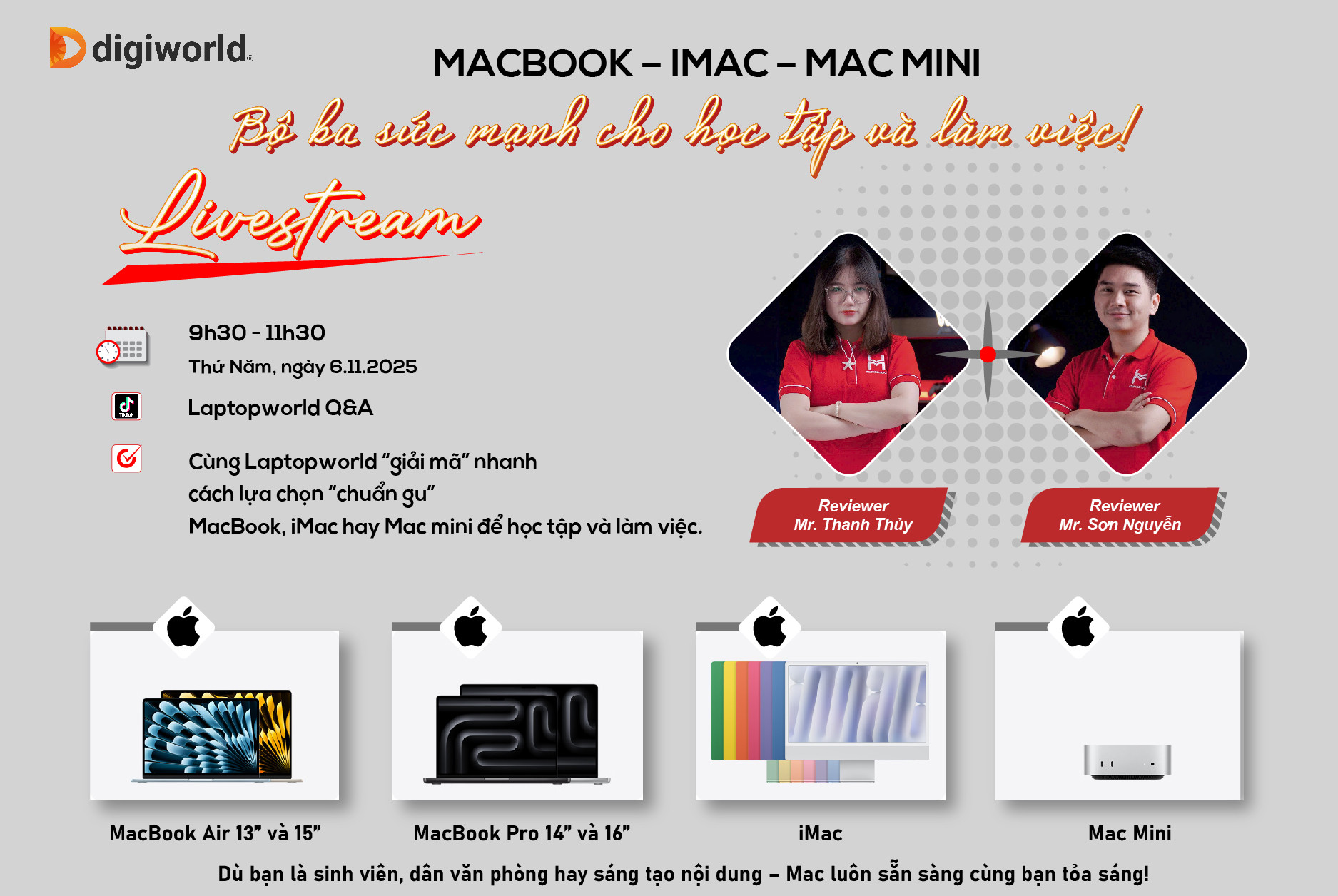 3. Nội dung buổi Livestream: Cách lựa chọn Mac Book - iMac - Mac Mini với từng nhu cầu. Tối ưu cho sinh viên, dân văn phòng, nhà sáng tạo nội dung cùng 2 reviewer công nghệ Thanh Thủy & Sơn Nguyễn