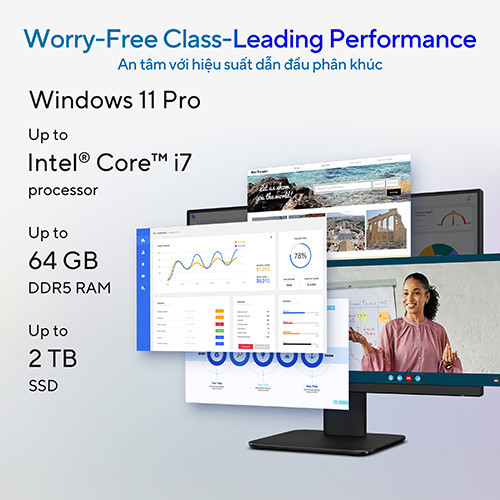 ASUS ExpertCenter P440 All-in-One PC được phát triển nhằm tối ưu việc vận hành và quản lý cho doanh nghiệp, mang đến hiệu suất xử lý nhanh chóng, tiết kiệm thời gian và giảm bớt gánh nặng quản trị. Sở hữu bộ vi xử lý lên đến Intel® Core™ i7, RAM tối đa 64GB DDR5 cùng nhiều tùy chọn kết nối linh hoạt, thiết bị mang lại hiệu năng mạnh mẽ cho mọi tác vụ. Với thiết kế nhỏ gọn nhưng đạt chuẩn quân đội MIL-STD 810H, máy còn hỗ trợ tới 3 ổ cứng và RAID SSD kép, đảm bảo hoạt động ổn định và bền bỉ, đáp ứng đầy đủ nhu cầu khắt khe của doanh nghiệp.