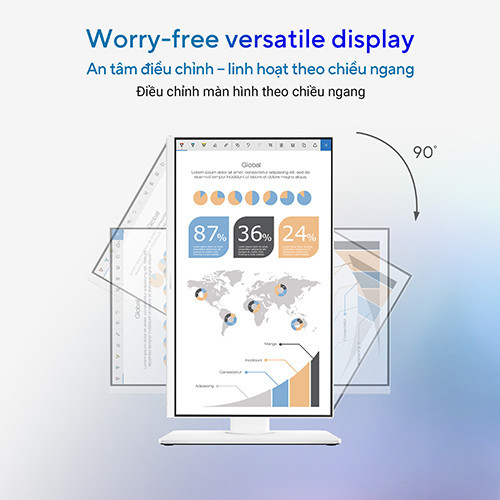 ASUS ExpertCenter P440 AiO là chiếc máy All-in-One mỏng nhất trong dòng sản phẩm của ASUS, nổi bật với thiết kế viền mỏng tràn cạnh cùng tỷ lệ màn hình trên thân máy đạt đến 93%, mang lại vẻ ngoài hiện đại và tinh tế. Trang bị màn hình cảm ứng 24 inch FHD², thiết bị cho góc nhìn rộng 178° và dải màu 100% sRGB, tái hiện hình ảnh sống động và chuẩn xác. Ngoài ra, màn hình được tích hợp công nghệ chống lóa và giảm ánh sáng xanh đạt chứng nhận TÜV Rheinland, giúp người dùng thoải mái sử dụng trong thời gian dài mà vẫn bảo vệ tốt cho đôi mắt.