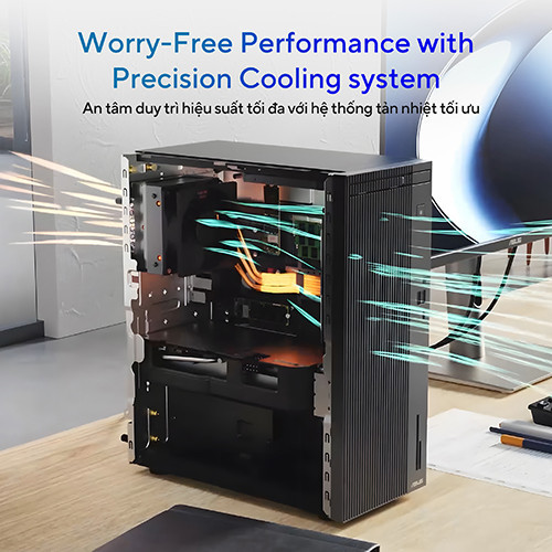 Công nghệ tản nhiệt Tower Air Cooler thế hệ mới giúp nâng hiệu năng CPU Intel® Core™ i7 lên đến 38%7 nhờ diện tích tản nhiệt lớn gấp 4 lần8 so với máy tính để bàn truyền thống. ASUS ExpertCenter P500 Mini Tower được trang bị ba ống dẫn nhiệt phẳng 6,7 mm kết hợp cùng quạt hiệu suất cao 9 cm, mở rộng tối đa khả năng tản nhiệt. Thiết kế đột phá này mang lại tổng diện tích tản nhiệt ấn tượng 3.402 cm², cải thiện rõ rệt hiệu quả làm mát và đảm bảo hệ thống vận hành ổn định, mượt mà trong mọi tác vụ.