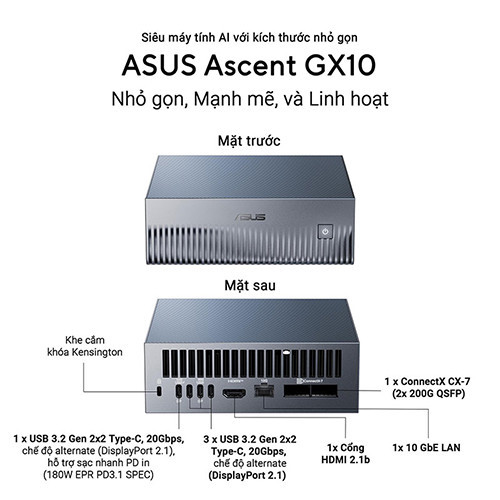 Cổng I/O bên (Mặt trước): 1 x Power button Cổng I/O sau: 1 x USB 3.2 Gen2 Type-C (with DP1.4 output and PD input) 1 x USB 3.2 Gen2 Type-A 2 x HDMI 2.1 (Up to 4K@60Hz) 1 x Configurable Port 1 x 2.5G RJ45 LAN 1 x Padlock ring 1 x DC-in |