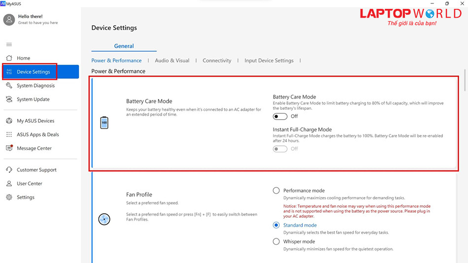 Để giúp bảo vệ pin khi người dùng thường xuyên cắm sạc, ASUS tích hợp tính năng Battery Health Charging, còn được gọi là Battery Care Mode trên một số dòng máy, vào ứng dụng MyASUS hoặc mục Device Settings.