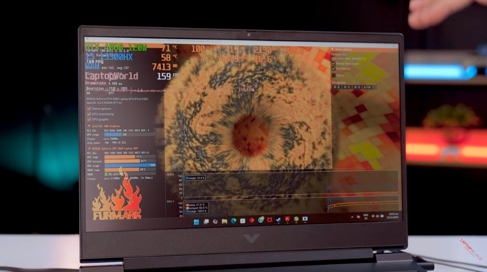 Ở bài test Furmark với độ phân giải Full HD, RTX 4060 giữ mức công suất ổn định 120W, FPS dao động 155 – 160 FPS – quá ấn tượng.