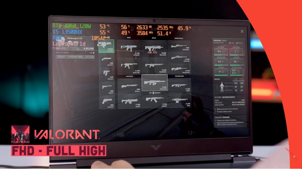 Ở Valorant (Full HD – High), RTX 4060 chỉ tiêu thụ 40–50W, nhưng FPS vẫn đạt 200+ FPS. Nhiệt độ thì quá bất ngờ: GPU ~55°C, CPU cũng không chạm 60°C.