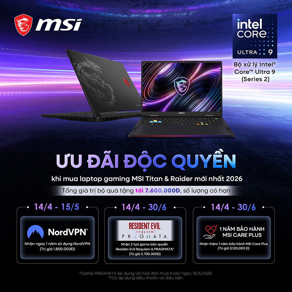 1. Tên chương trình: ƯU ĐÃI ĐỘC QUYỀN khi mua laptop Gaming MSI Raider & Titan 2026 nhận ngay bộ quà 7.600.000 đồng